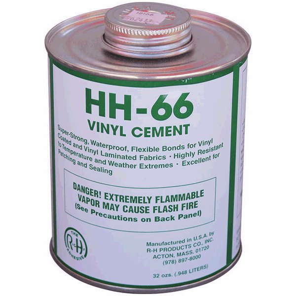 HH-66 is a super-strong and long lasting waterproof cement that provides a clear flexible bond for vinyl coated and vinyl laminated fabrics. Resistant to extreme temperature and all weather conditions. Excellent for sealing and patching, can be used indoors and outdoors. Dry’s in 3 to 5 minutes, covering up to 30 square feet.